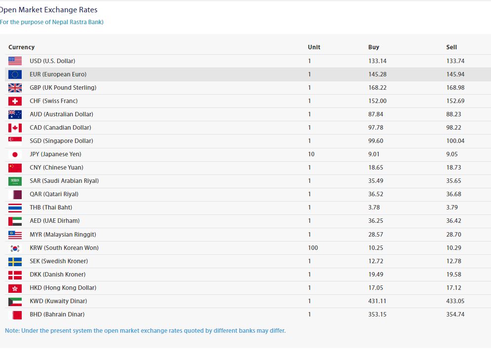 राष्ट्र बैंकले हिजो अमेरिकी डलरको १ को खरिद दर १३३ रुपैयाँ ०३ पैसा र बिक्री दर १३३ रुपैयाँ ६३ पैसा र युरोपियन युरो एकको खरिद दर १४५ रुपैयाँ ९९ पैसा र बिक्री दर १४६ रुपैयाँ ६५ पैसा तोकेको थियो ।