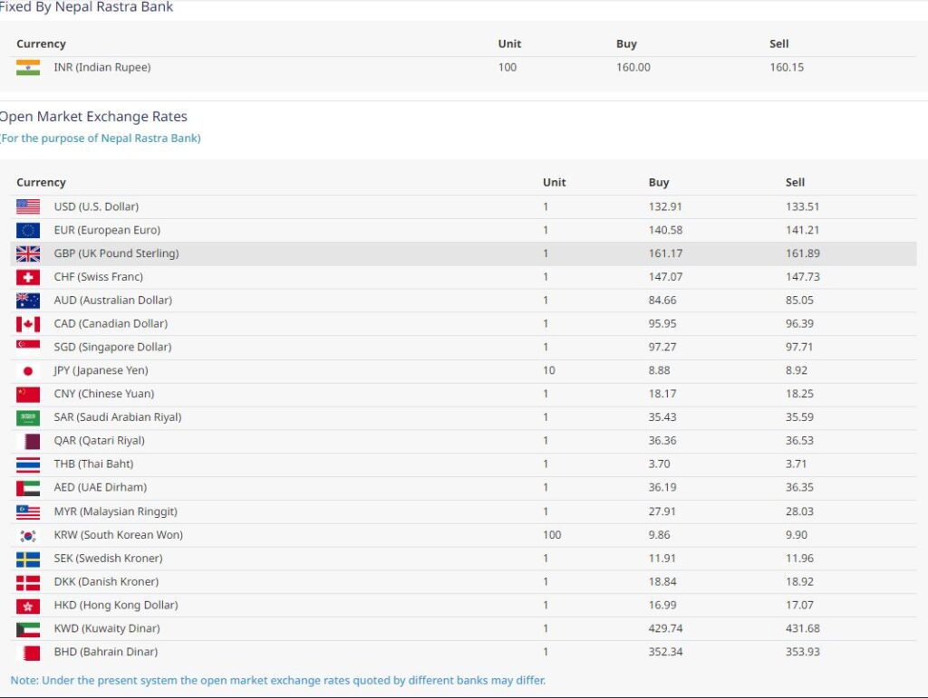 राष्ट्र बैंकले आजका लागि अमेरिकी डलरको एकको खरिद दर १३२ रुपैयाँ ९१ पैसा र बिक्री दर १३३ रुपैयाँ ५१ पैसा तथा युरोपियन युरो एकको खरिद दर १४० रुपैयाँ ५८ पैसा र बिक्री दर १४१ रुपैयाँ २१ पैसा कायम गरेको छ ।