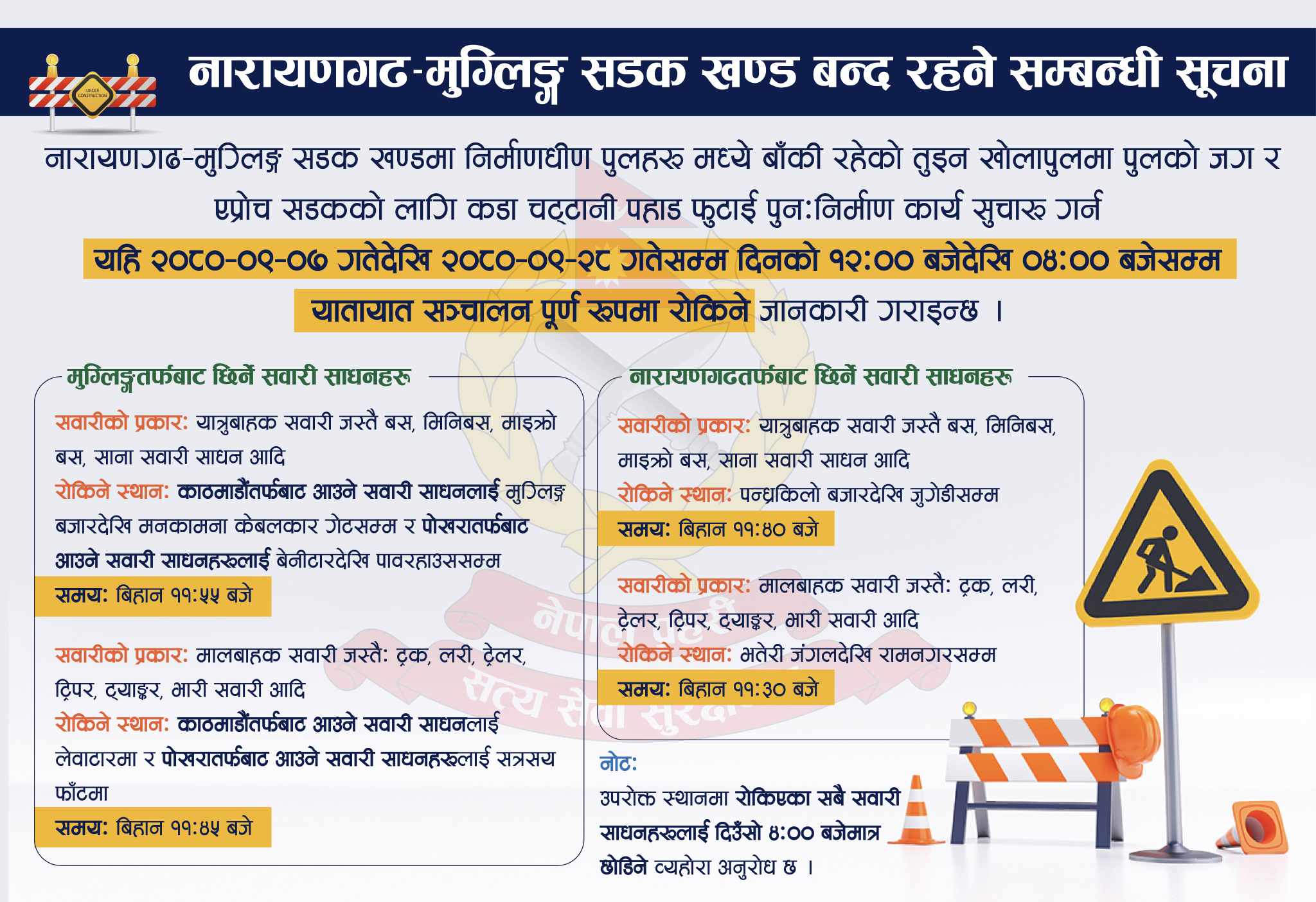 मुग्लिङतर्फ छिर्ने ट्रक, लरी, ट्रेलर, ट्रिपर, टयाङक र भारी सवारी साधान भने लेवाटार र सत्रसय फाँटमा रोकिनेछन भने नारायणगढतर्फ छिर्ने यस्ता सवारी साधानहरू भतेरी जंगल देखी रामनगरसम्म रोकिने ट्राफिक प्रहरीले जनाएको छ ।
