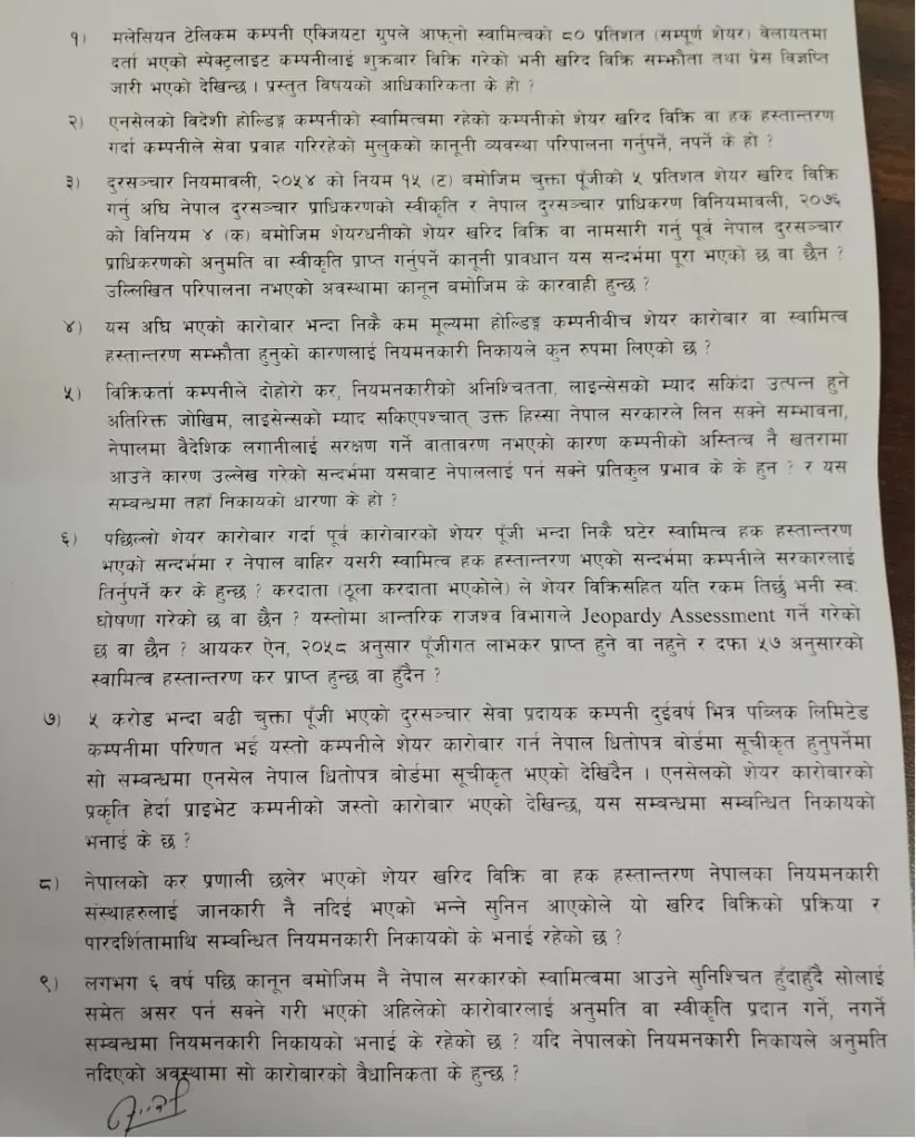 समितिले एनसेलमा लगानी गरेका विदेशी कम्पनीहरूको शेयर खरिद–बिक्री प्रक्रिया र विधिसम्मत हो कि होइन? भनी प्रश्न गरेको छ । लेखा समितिले पत्राचार गरेका निकायहरू दूरसञ्चार सेवा प्रदायकलाई कुनै न कुनै रूपमा नियमन गर्ने निकायहरू पर्छन् ।