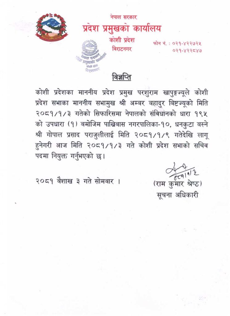 विराटनगर । कोशी प्रदेश सभाको सचिवमा गोपाल प्रसाद पराजुली पुन: नियुक्त भएका छन् । सोमबार प्रदेश प्रमुख परशुराम खापुङ्गले ९ वैशाखदेखि लागू हुने गरी पोखरेललाई नियुक्त गरेका हुन् ।