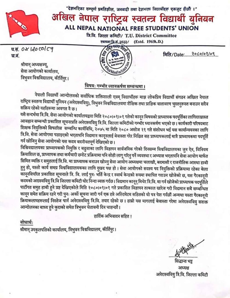 अनेरास्ववियु त्रिवि जिल्ला कमिटी अध्यक्ष सिद्धान्त भट्टले एक विज्ञप्ति जारी गर्दै आयोगले २०८० वैशाख १ गते कानुन विषयको प्राध्यापक पदपूर्तिका लागि दरखास्त आह्वान गरेकोप्रति गम्भीर ध्यानाकर्षण भएको उल्लेख गरेका छन् ।