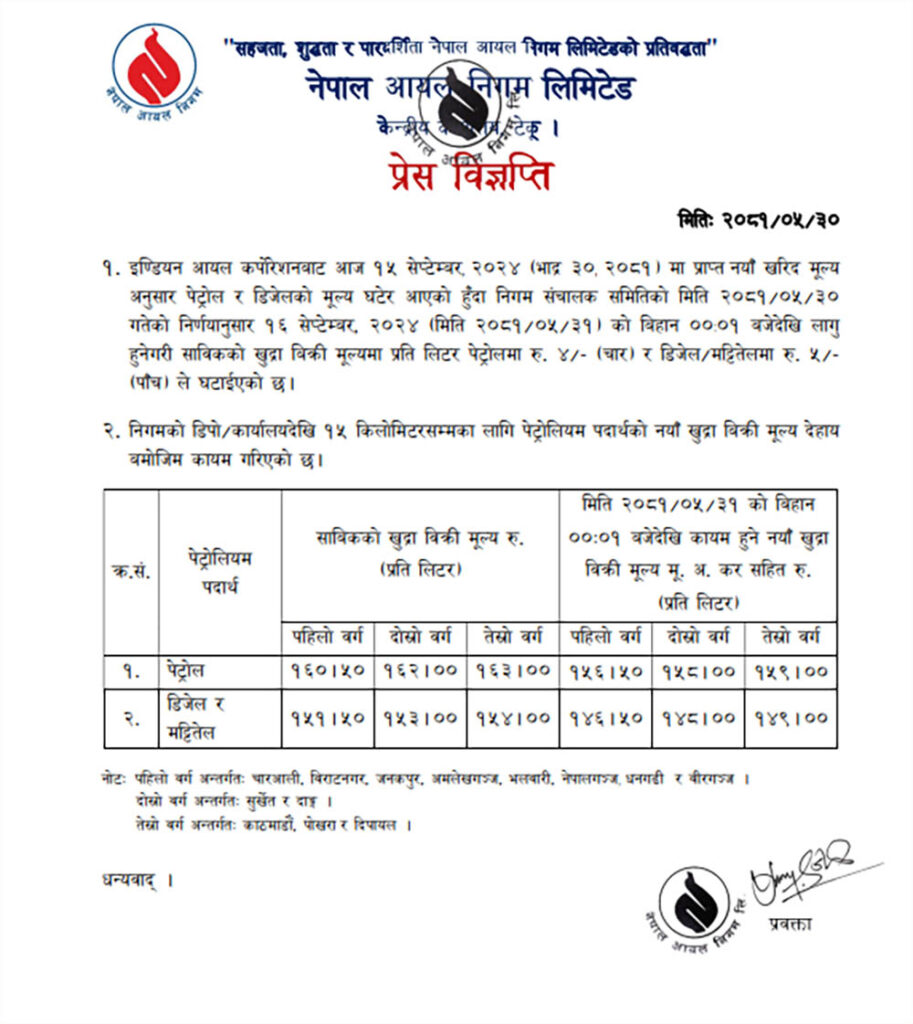 निगमले घटेको मुल्य आज राति १२ बजेदेखि लागि हुने निगमले जनाएको छ ।