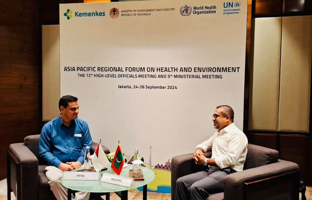 इन्डोनेसियाको राजधानी जकार्तामा आयोजित एसिया प्यासिफिक क्षेत्रका स्वास्थ्य तथा वातावरण मन्त्रीहरूको बैठकमा नेपालका स्वास्थ्य तथा जनसंख्या मन्त्री प्रदीप पौडेल र माल्दिभ्सका स्वास्थ्यमन्त्री अब्दुल्ला खलीलबीच द्विपक्षीय वार्ता भएको छ। यस वार्तामा नेपाल र माल्दिभ्सबीच स्वास्थ्य क्षेत्रमा सहयोग आदानप्रदानबारे विस्तृत छलफल भएको हो।