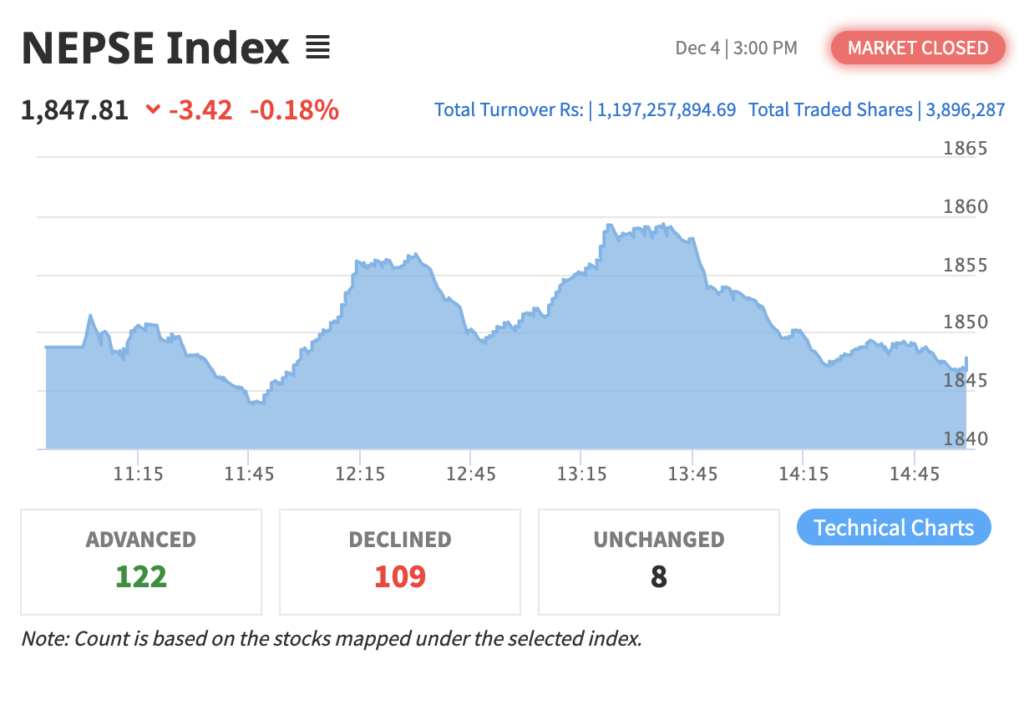 आइतबार सात दशमलव २९ अङ्कले घटेको नेप्से परिसूचक आज तीन दशमलव ४२ अङ्कले घटेको छ । आजको कारोबारपछि नेप्से परिसूचक एक हजार आठ सय ४७ दशमलव ८१ अङ्कमा कायम भएको छ ।