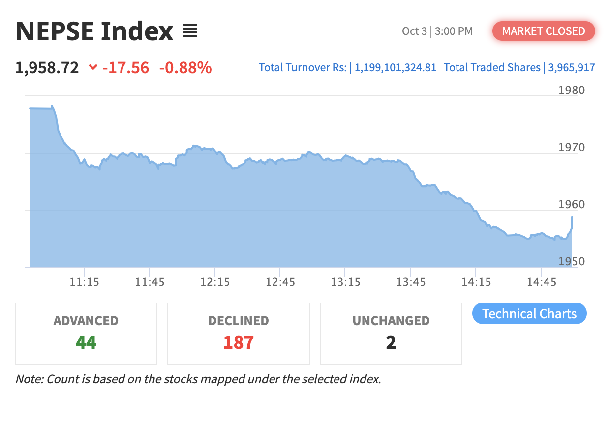 काठमाडौ, १६ असोज । सेयर बजारमा फेरि गिरावटकै सिलसिला चलेको छ ।