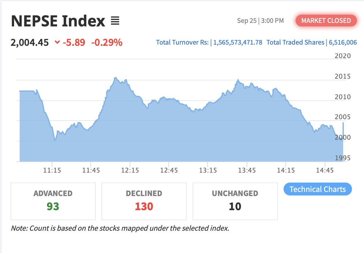 काठमाडौ, ८ असोज । सेयर बजारमा सोमबार पनि करेक्सन जारी रहेको छ । यस दिन नेप्से सूचक ५.८९ विन्दुले घटेर २००४.४५ अंकमा आएर अडिएको छ । बजार घटेर पुनः २ हजारको मनोवैज्ञानिक विन्दु नजिक आएको हो । अब मंगलबार नेप्से यो मनोवैज्ञानिक विन्दुबाट माथि जान्छ वा तल झर्छ भन्ने लगानीकर्तामा पुनः चासो बढेको छ ।