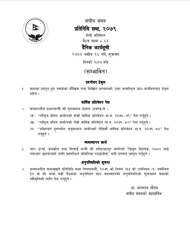 ऊर्जा, जलस्रोत तथा सिचाईमन्त्री शक्तिबहादुर बस्नेतले ‘विधुत विधेयक, २०८० दफावार छलफलका लागि सम्बन्धित समितिमा पठाउन प्रस्ताव गर्नेछन भने सभामुख देवराज घिमिरेले चालु संसदको अधिवेसनमा १० पटक भन्दा बढी अनुपस्थित प्रतिनिधि सभाका सदस्यहरुको नामावली सुनाउने कार्यसुचीमा उल्लेख गरिएको छ ।