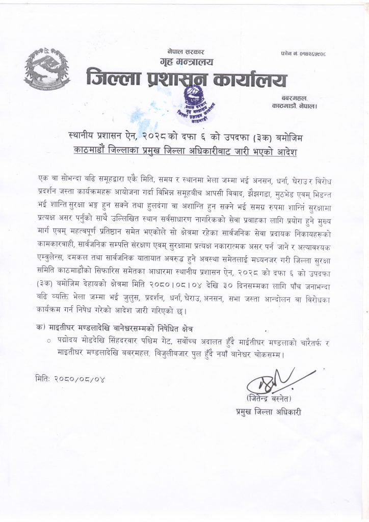 सोमबारदेखि आगामी ३० दिनसम्मका लागि निषेधित क्षेत्र घोषणा गरिएको काठमाडौंका प्रमुख जिल्ला अधिकारीले जितेन्द्र बस्नेतले एक विज्ञप्तिमार्फत जनाएको छ।