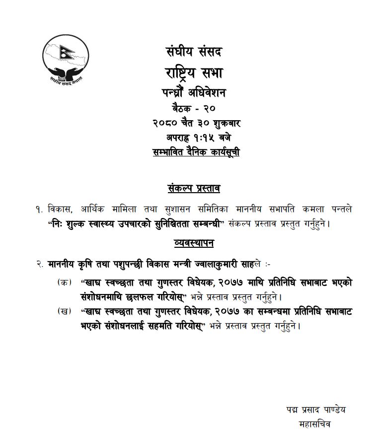 कृषी तथा पशुपन्छी विकास मन्त्री ज्वालाकुमारी साहले ‘खाध्ध स्वच्छता तथा गुणस्तर बिधेयक २०७७ प्रतिनिधिसभावाट भएका संसोधन माथी छलफल गरियोस’ र सो ‘संसोधनलाइ सहमति गरियोस्’ भन्ने प्रस्ताव प्रस्तुत गर्ने महासचिव पदम प्रसाद पाण्डेले सार्बजनिक गरेको सम्भावित कार्यसुचीमा उल्लेख रहेको छ ।