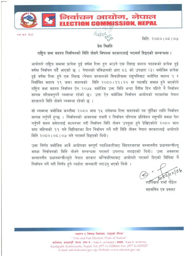 आयोगले विहिबार एक प्रेस विज्ञप्ति जारी गर्दै राष्ट्रपतिबाट मनोनित एक सहित १९ जना सदस्यहरुको आगामी फागुनमा २० गते रिक्त हुने जनाएको छ।