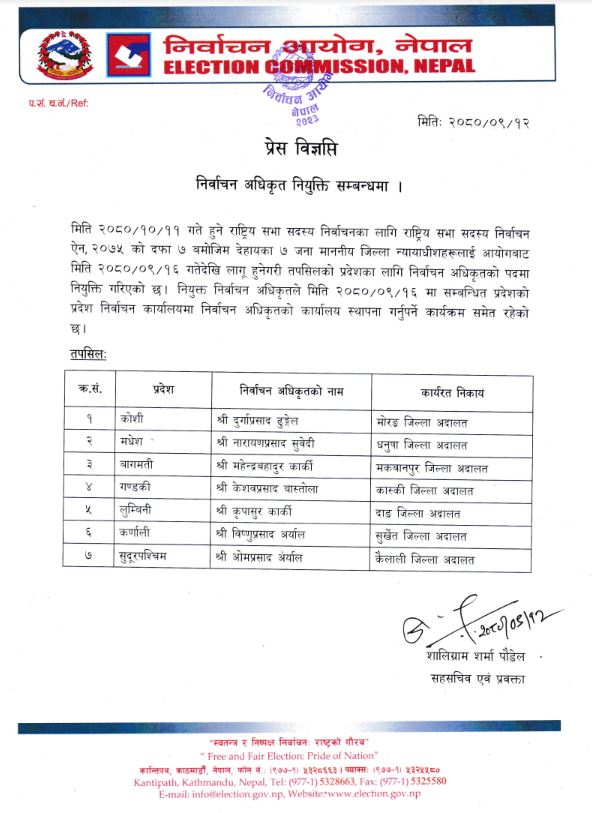 उनका अनुसार १६ पुसदेखि लागु हुनेगरी कोशी प्रदेशका लागि मोरङ जिल्ला अदालतका न्यायाधीश दुर्गाप्रसाद ढुंगेल, मधेश प्रदेशका लागि धनुषा जिल्ला अदालतका न्यायाधीश नारायणप्रसाद सुवेदी, बागमती प्रदेशका लागि मकवानपुर जिल्ला अदालतका न्यायाधीश महेन्द्रबहादुर कार्की, गण्डकी प्रदेशका लागि कास्की जिल्ला अदालतका न्यायाधीश केशवप्रसाद बास्तोला, लुम्बिनी प्रदेशका लागि दाङ जिल्ला अदालतका न्यायाधीश कृपासुर कार्की, कर्णाली प्रदेशका लागि सुर्खेत जिल्ला अदालतका न्यायाधीश विष्णुप्रसाद अर्याल र सुदूरपश्चिम प्रदेशका लागि कैलाली जिल्ला अदालतका न्यायाधीश ओमप्रसाद अर्याललाई निर्वाचन अधिकृतको पदमा नियुक्त गरिएको हो ।