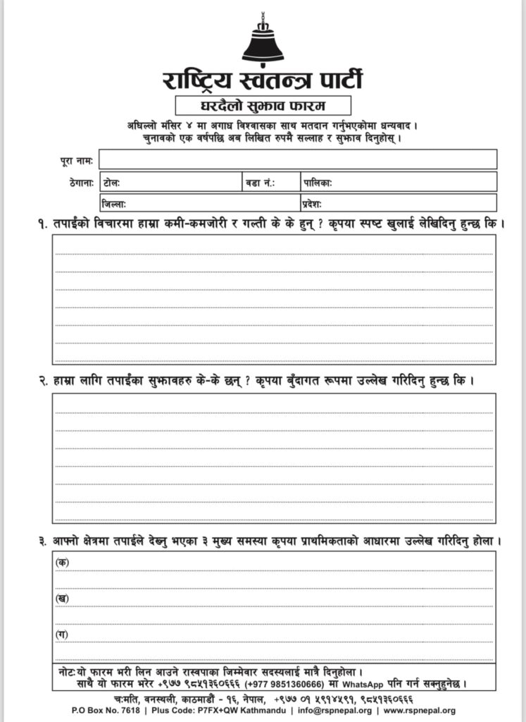 काठमाडौं, २ मंशिर । राष्ट्रिय स्वतन्त्र पार्टीका सांसदहरु आजबाट घरदैलो गर्ने भएका छन् ।