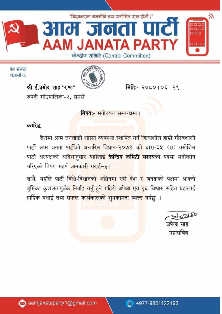 उनी यसअघि रास्वपा सप्तरी जिल्ला सभापति रहेका थिए। इन्जिनियरसमेत रहेका शाहलाई आम जनता पार्टीले केन्द्रीय सदस्यमा मनोनितगरेको जनाएको हो।