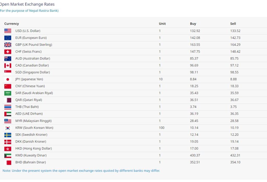 राष्ट्र बैंकले आजका लागि अमेरिकी डलरको १ को खरिद दर १३२ रुपैयाँ ९२ पैसा र बिक्री दर १३३ रुपैयाँ ५२ पैसा कायम गरेको छ भने युरोपियन युरो एकको खरिद दर १४१ रुपैयाँ ८ पैसा र बिक्री दर १४२ रुपैयाँ ७३ पैसामा कारोबारको अनुमति दिएको छ ।