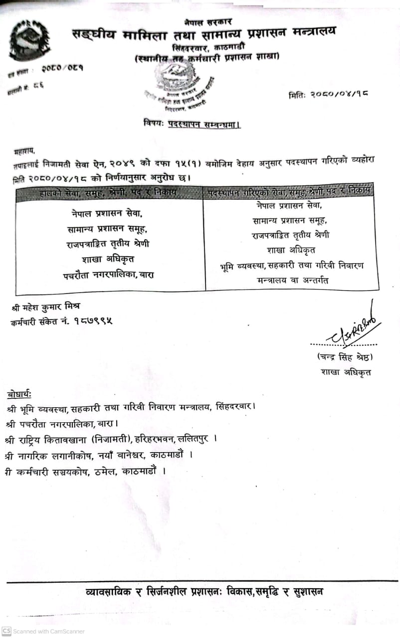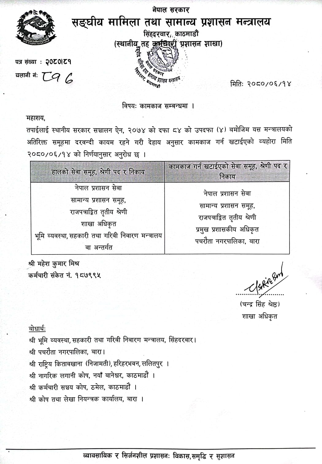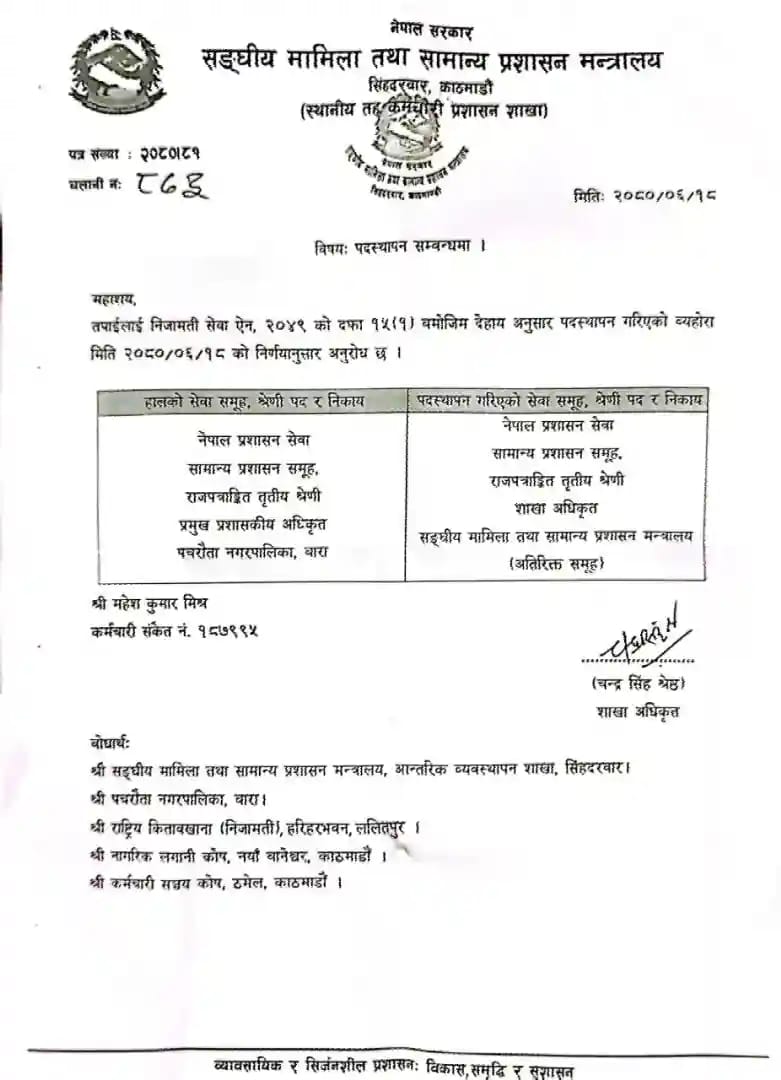उनले भने, “मन्त्रालयबाट साउन १८ मा प्रमुख प्रशासकीय अधिकृत महेस कुमार मिश्रको सरुवाको पत्र आयो तर विकल्पमा अर्को प्रमुख प्रशासकीय अधिकृतको नाम आएन । प्रमुख प्रशासकीय अधिकृतको पद रिक्त राखियो । पुन: असोज १४ गते उनको पचरौता नगरपालिकामै सरुवा भएको पत्र प्राप्त भयो र हिजो फेरि पुन: सरुवाको पत्र प्राप्त भयो ।”