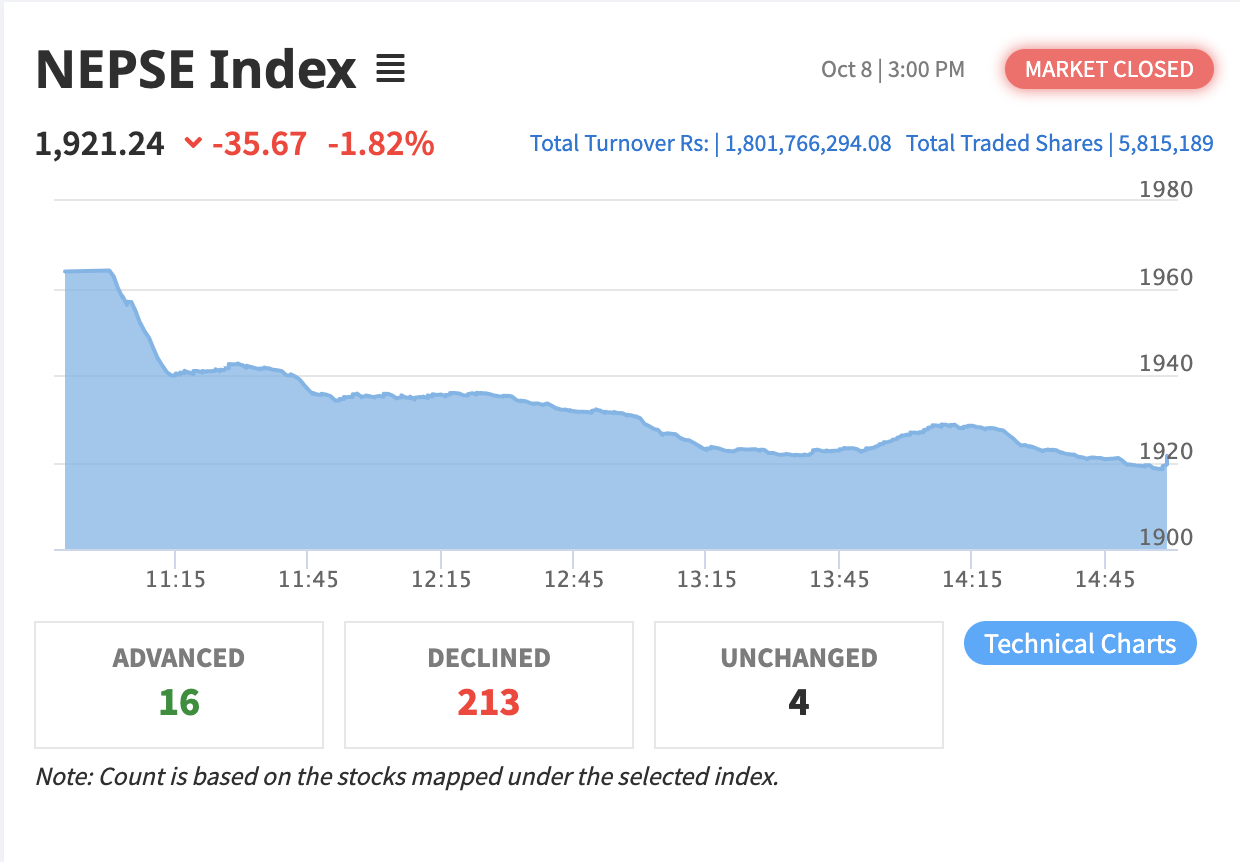 काठमाडौ, २१ असोज । केन्द्रीय बैंकको नयाँ निर्देशनप्रति सेयर बजारका लगानीकर्ता बेखुशी देखिएका छन् । नयाँ निर्देशन जारीपछि आइतबार बजार खुलेको हो । तर यस दिन सेयर बजार परिसूचक ३५.६७ अंकले घटेर १९२१.२४ अंकमा आइपुगेको छ । १ अर्ब ८० करोड रुपैयाँभन्दा बढीको सेयर कारोबार भएको छ भने सबै समूह घटेका छन् ।