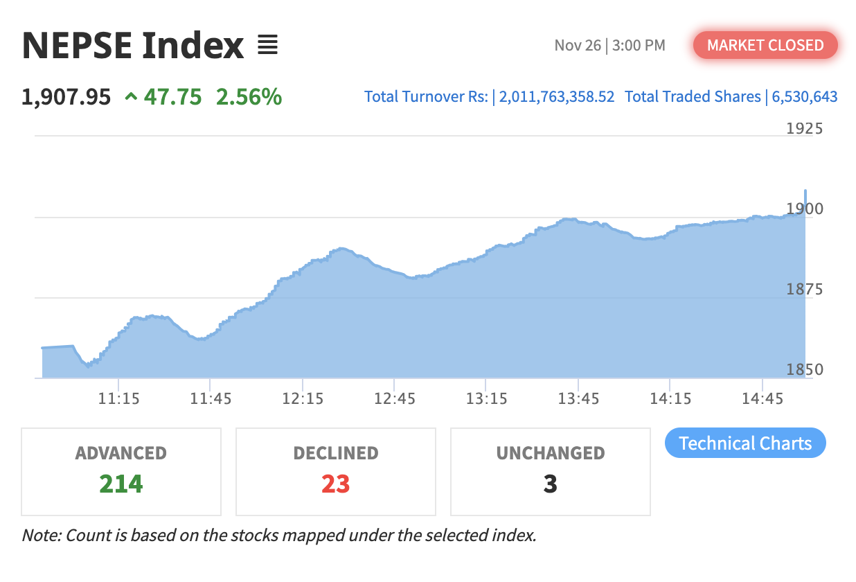 सेयर बजार ४७.७५ अंकले बढ्यो, २ अर्बभन्दा बढीको कारोबार